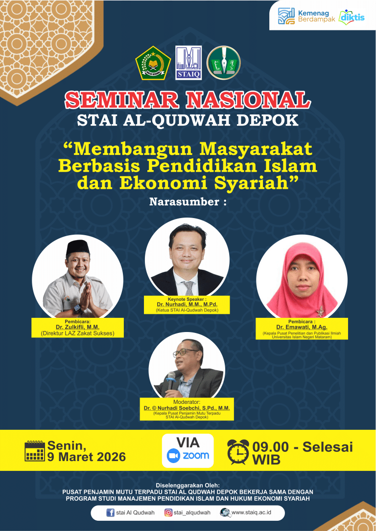 MediaSTAIQ. Senin 9 Maret 2026, Sekolah Tinggi Agama Islam Al-Qudwah Depok menggelar seminar nasional. Seminar online yang mengusung tema “Membangun Masyarakat Berbasis Pendidikan & Ekonomi Islam” ini diikuti oleh kurang lebih 150 peserta, yang sebahagian besarnya adalah mahasiswa semester…